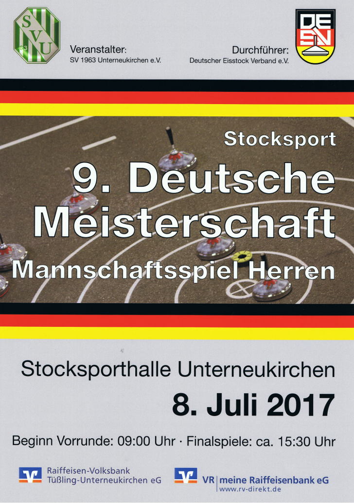 Im Rahmen der 27. Mitgliederversammlung des Deutschen Eisstock-Verbandes e.V. am 30.04.2016 in Frankfurt a. Main wurde dem SV Unterneukirchen die Durchführung der 9. Deutschen Meisterschaft im Mannschaftsspiel der Herren auf Sommerbahnen übertragen.
